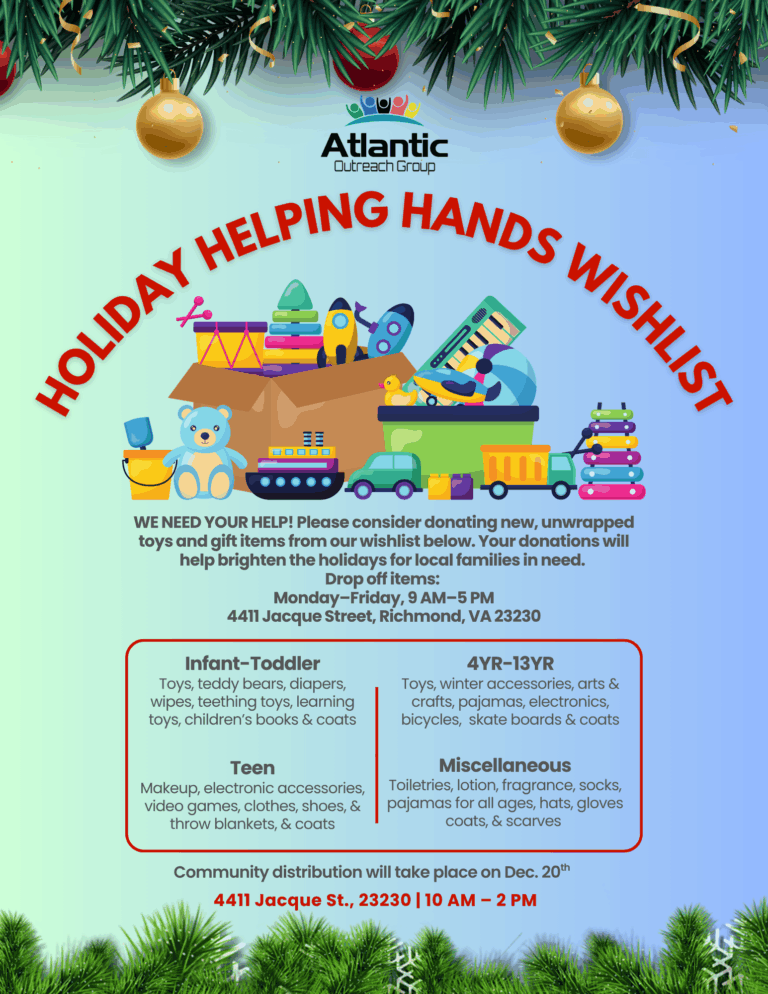 Please consider donating new, unwrapped toys and gift items from our wishlist below. Your donations will help brighten the holidays for local families in need. Community distribution will take place on Dec. 20th, 10AM-2PM